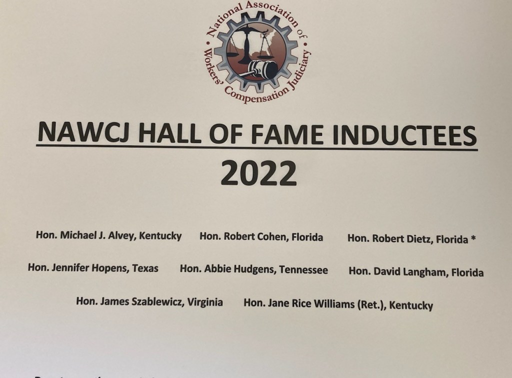 Last week in Orlando, Florida, Abbie was inducted into the National Association of Workers’ Compensation Judiciary Hall of Fame. The NAWCJ sought nominations from current members across the country, and a committee voted on the inductees.