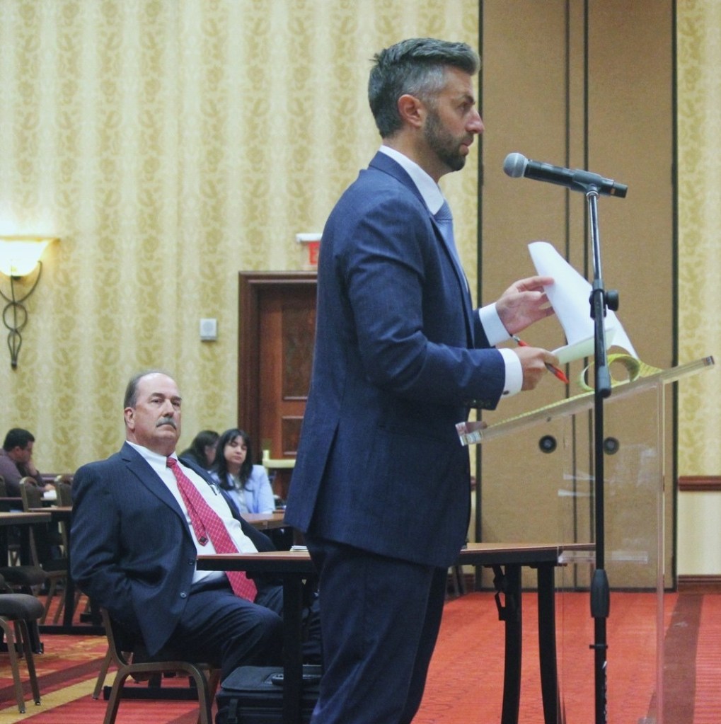Defense attorney Connor Sestak argues his case, while plaintiff lawyer Mike Wagner looks on. Photos by Kyle Jones, communications program coordinator, Bureau of Workers’ Compensation.