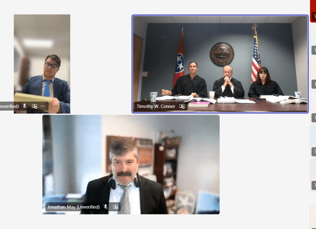 The Board heard virtual arguments on September 23. Top left: Brayden Hunter for Professional Care Services; Top right: Judges Pele Godkin, Timothy Conner, and Meredith Weaver. Bottom: Jonathan May for Ms. McCool.